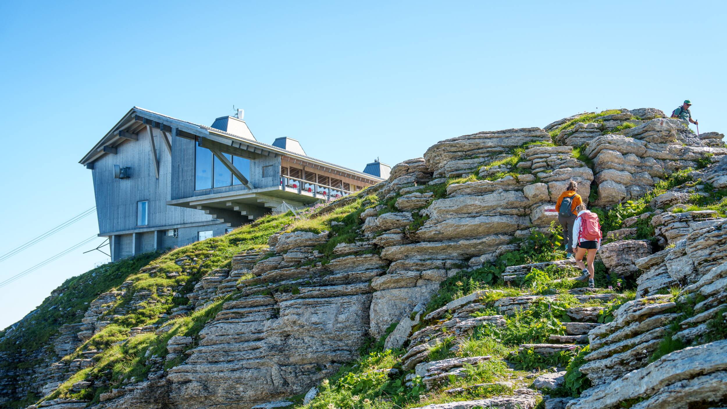 Über den Verbindungsgrat gelangen Sie nach wenigen Schritten zum Chäserrugg und werden im Gipfelgebäude von Herzog & de Meuron mit einer raffinierten Gastronomie empfangen.