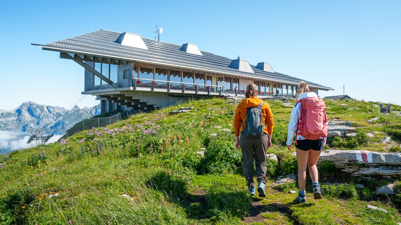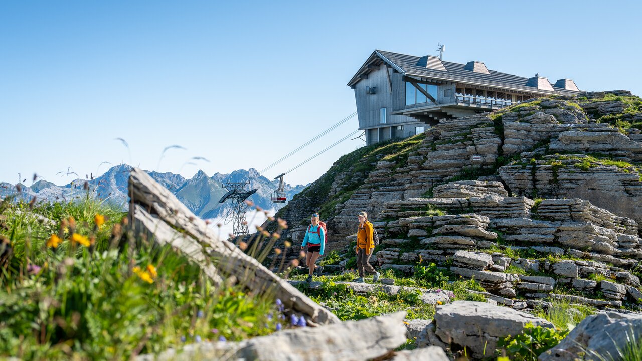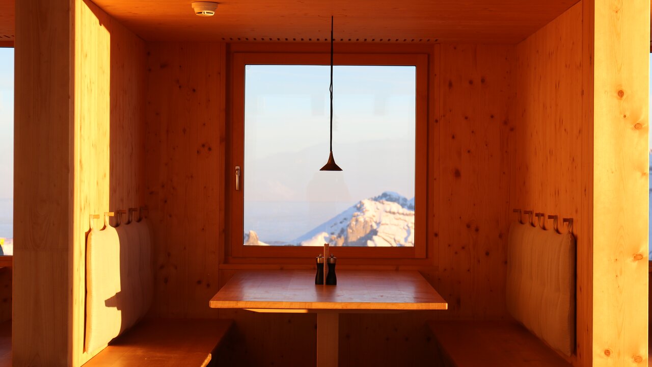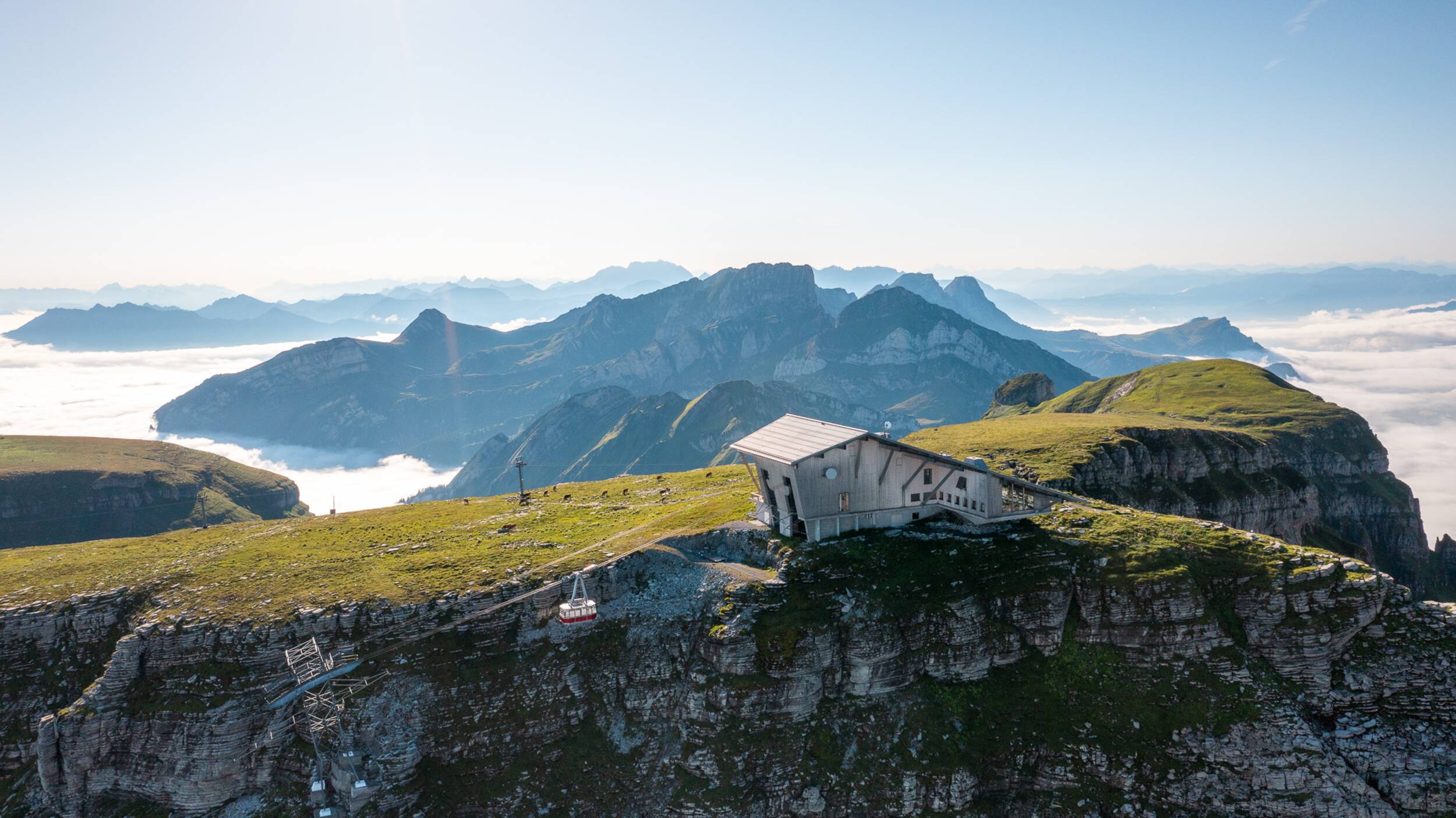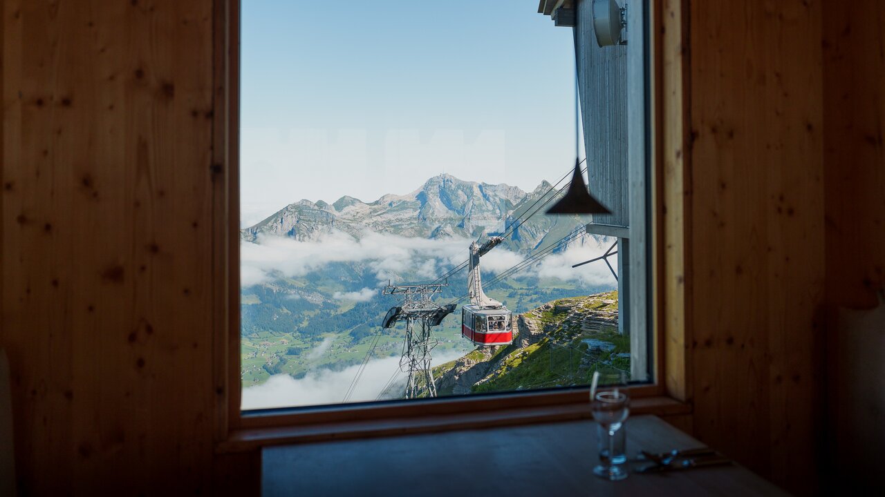Die Bergstation der Luftseilbahn mit dem dazugehörigen Seilschacht und den Technikräumen, ein pragmatischer Stahl- und Betonbau aus den 70er-Jahren, blieben bestehen und wurden 2015 durch einen neuen Gebäudeteil, das heutige Gipfelrestaurant, ergänzt. Dieser, nach Süden orientierte Teil, bildet durch seine vergleichsweise ausgedehnte Breite mit dem anderen Gebäudeteil eine Art Dreieck. Verbunden sind sie durch einen tennartigen und offene Abschnitt, der während dem Durchschreiten einen einzigartigen Ausblick auf den Alpstein ermöglicht.