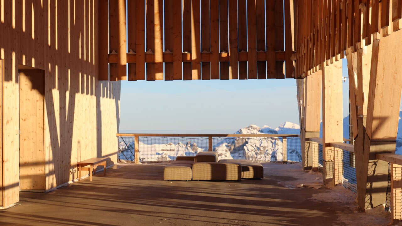 Den Anspruch auf ein ressourcenschonendes Bauen wurde in allen Phasen der Projektentwicklung, des Baus und nun des Betriebes berücksichtigt. Um einen möglichst geringen Einfluss auf die Umgebung zu haben, steht das Bauwerk auf drei Streiffundamenten und hinterlässt einen aufs Minimum reduzierten Fussabdruck. Mit Ausnahme des Krans wurden alle Materialien und Mobilien mit der Luftseilbahn auf 2'262 m ü. M. transportiert. Realisiert wurde das Projekt in enger Zusammenarbeit mit ortansässigen Unternehmen. Das Wissen aus dem Tal floss nachhaltig in die Ziele des ressourcenschonenden Bauens und dem Erhalt der Authentizität des Landschaftsbildes ein.